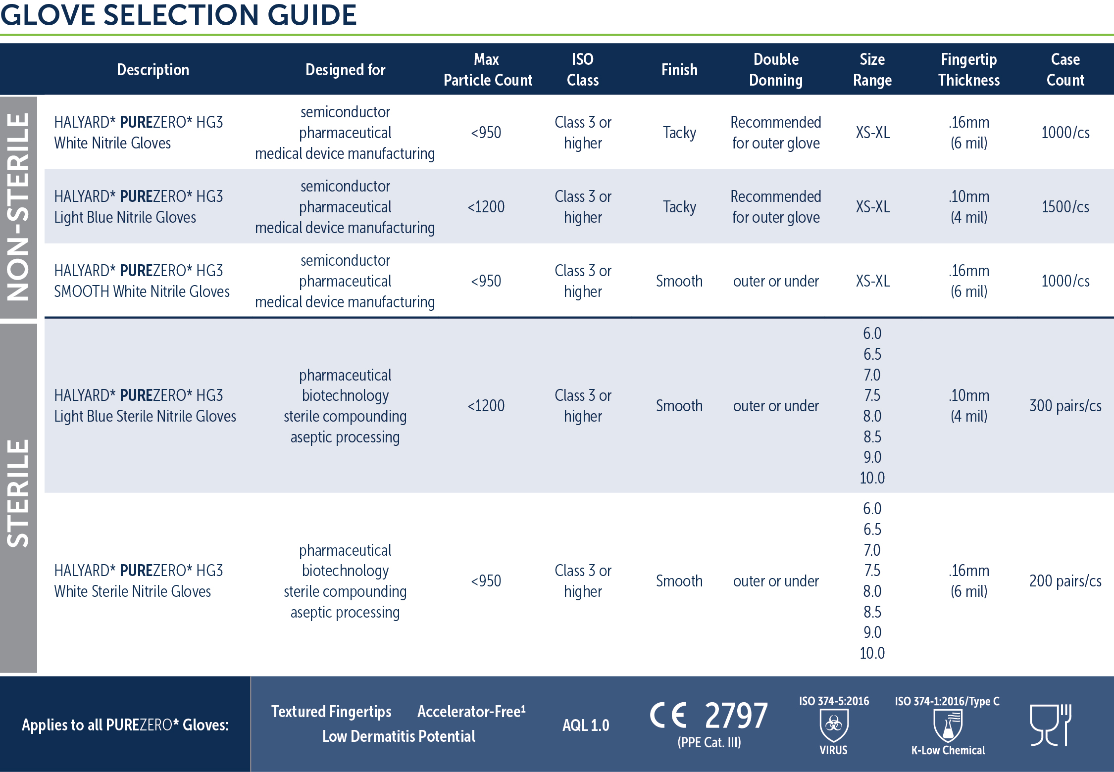 HALYARD* offers an accelerator-free1 portfolio of three non-sterile and two sterile cleanroom gloves to address the needs of Pharmaceutical, Medical Device, Microelectronics and Semiconductor Manufacturing.